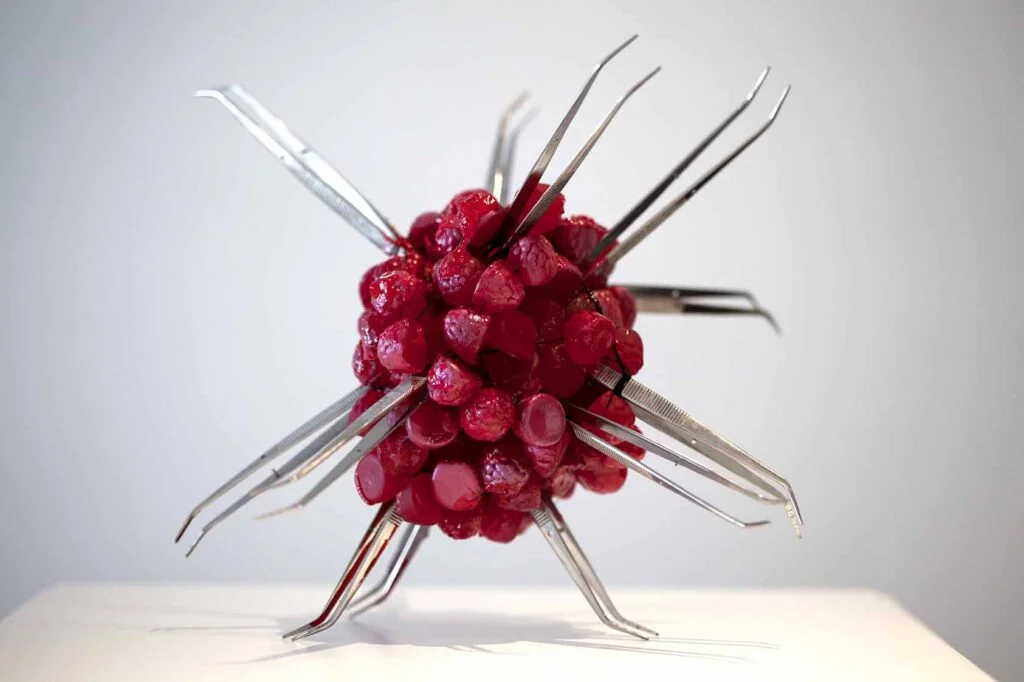 raspberry lollies, stainless steel surgical tweezers, thread, moulding clay, acrylic paint, glue