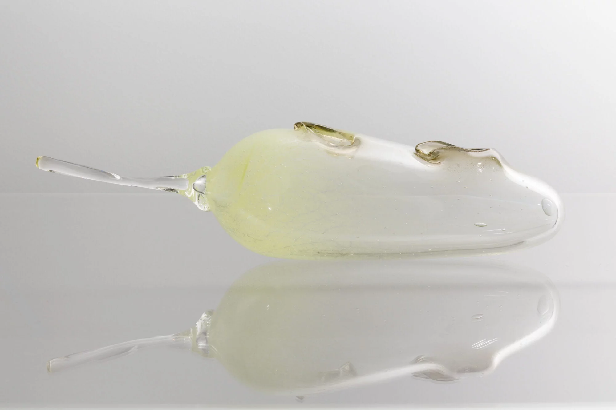 Image Description: A photograph of a hand-blown glass object against a grey background. The object is yellow at its largest point, becoming transparent glass towards the tip. It is on a reflective surface and represents an Australian bush banana. Two gaping holes have punctured the glass, giving the piece a wounded quality.