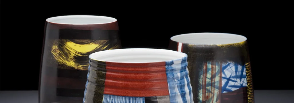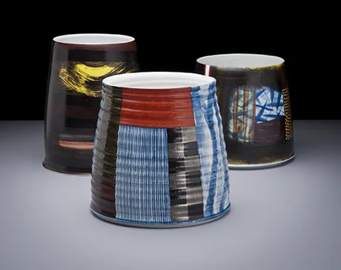 My ceramic vessels present an elegant physicality of form characteristic of oriental porcelain traditions. Respect for the materials is integral to my creative language, allowing for a certain restraint and emphasis of formal sculptural qualities. The sheared cone vessels echo a simplicity of line akin to Japanese ceremonial dotaku bells. Adorned with imagery drawn freehand or loosely imprinted in undulating grids, the fluent integration of surface with object creates a sense of ‘wholeness’ or ‘purity’ that remains dynamic. The vessel appears as a conversation between the painted mark and three dimensional form in a kind of alchemy that does not eschew its reading as a functional artefact.