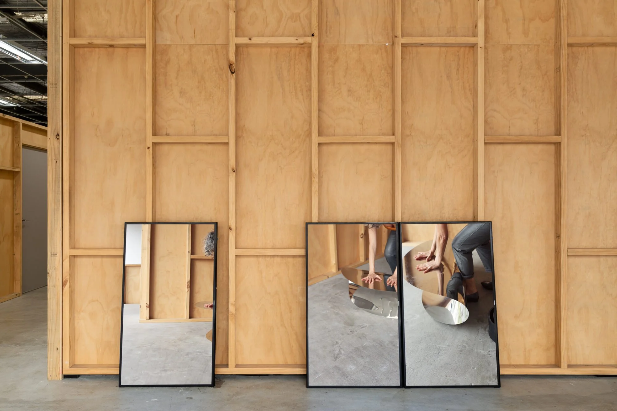 Multi-channel channel video and sonic recording (14:50 min) synchronized and looped, with spatialised configuration. Choreographic score design and development: Helen Grogan. Choreographic score enaction for Gertrude Contemporary foyer site: Shelley Lasica. Sound Recordist: Liam Power