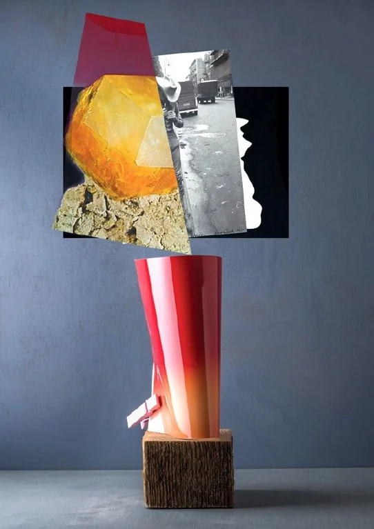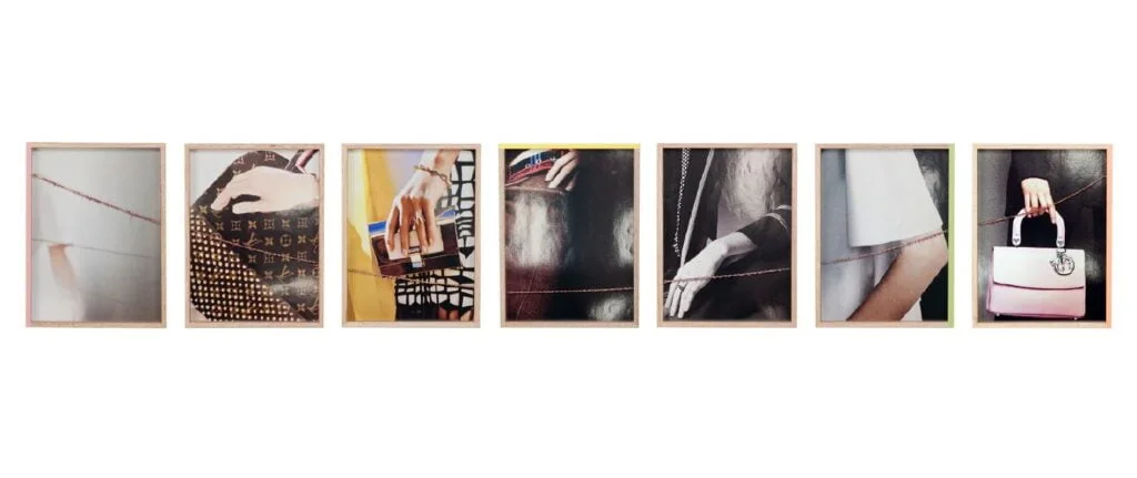 Digital collage containing found images of silk scarves, fashion photographs, artist photographs, printed on silk habotai, 100 x 100 cm